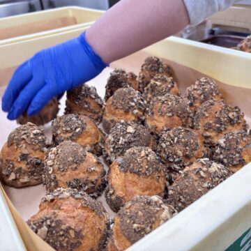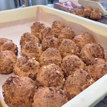 「せんべいシュー」とは、シュー皮におせんべいをまぶしたシュークリームです。